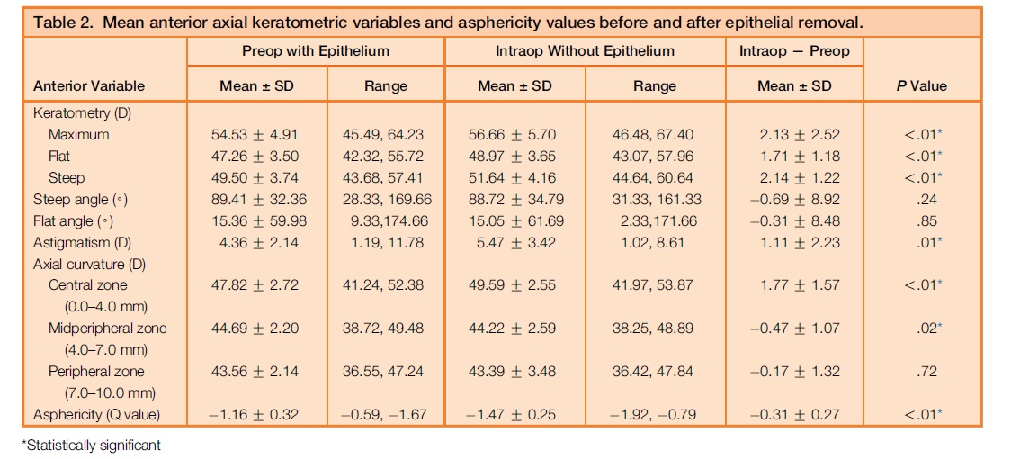 Results indicate that the corneal epithelium plays an important masking role in the anterior curvature variables of